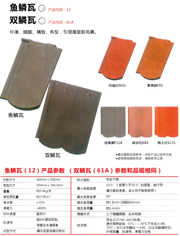 由于生產廠家用材不一樣因此色調也一些不一樣。在色調耐受性上,整體瓦比鍍層瓦好一些,整體瓦保色時間更久,鍍層瓦一般3-五年色調固色。從美觀大方上看,涂敷瓷磚表面光滑度高,一般瓷磚表面凸凹不平。因為瓷磚的表面上色是由混凝土黏合劑擠壓成型而成,因而不建議在風雪比較嚴重的地域應用涂有建筑涂料的瓷磚。